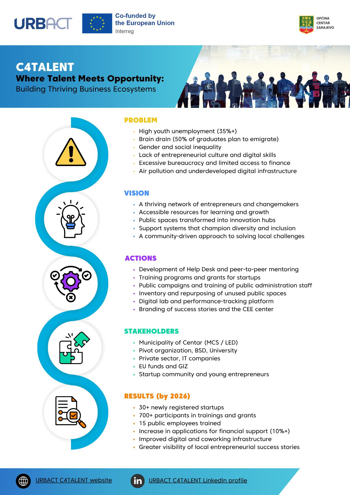 Kratki opis projekta: Projekat C4TALENT je posvećen stvaranju povoljnog ambijenta za razvoj biznisa i startup-a s ciljem privlačenja mladih profesionalaca kroz finansijsku podršku, co-working prostore i inkubatore. Vodeći partner je grad Nyiregyhaza (Mađarska), a u mreži učestvuju gradovi iz osam država: Bosna i Hercegovina, Poljska, Litvanija, Italija, Grčka, Belgija, Španija i Švedska. Projekat traje od 1. juna 2023. do 31. decembra 2025. godine. Ukupan budžet projektnog partnera iz BiH iznosi 73.600,00 EUR. Više informacija o ovom projektu je dostupno na sljedećem linku.