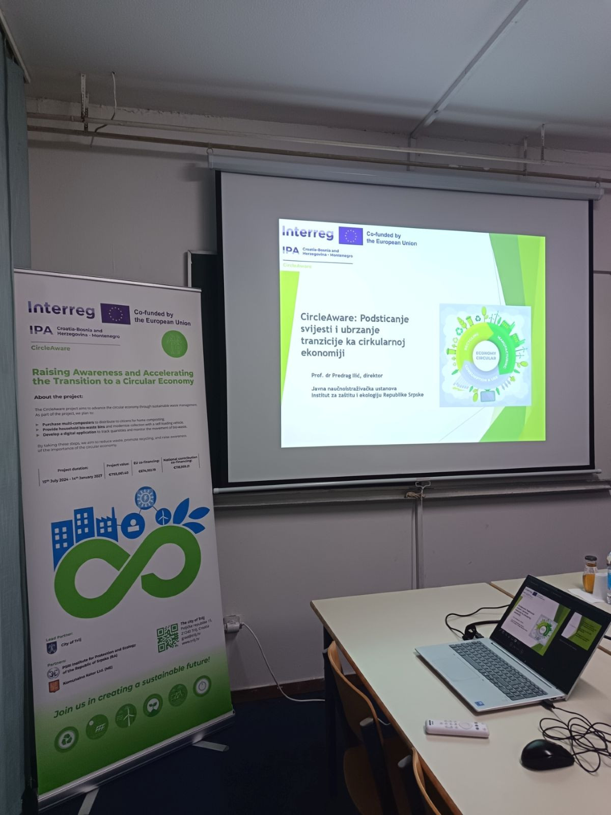 Kratki opis projekta: Cilj projekta je poboljšati osnovne uslove za provedbu politika kružne ekonomije u Gradu Trilju (HR), Gradu Banja Luka (BiH) i Općini Kotor (CG) ulaganjem u potrebnu infrastrukturu i opremu za upravljanje otpadom. Osim toga, planirano je organiziranje nekoliko edukativnih radionica i kreativnih takmičenja za djecu osnovnih i srednjih škola, s ciljem podizanja njihove svijesti o prednostima kružne ekonomije. Također, planirano je nekoliko projektnih aktivnosti koje imaju za cilj povećanje znanja i kompetencija ključnih sudionika politika kružne ekonomije u ciljnom projektnom području (kao što su studijske posjete, radionice i okrugli stolovi). Na kraju, planirano je kreiranje digitalnog rješenja za praćenje količine otpada odloženog na reciklažno dvorište u Gradu Trilju. Vodeći partner je Grad Trilj, a projekat se implementira u tri države: Hrvatska, Bosna i Hercegovina i Crna Gora. Projekat traje od 15. jula 2024. do 14. januara 2027. Ukupan budžet projekta iznosi 793.061,40 EUR, od kojih je 85% finansirano iz programa Interreg IPA Hrvatska – Bosna i Hercegovina – Crna Gora. Više informacija o ovom projektu je dostupno na sljedećem linku: Circ.leAware.