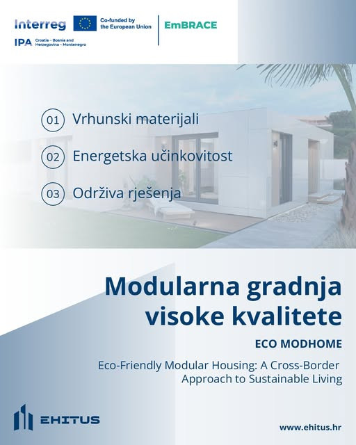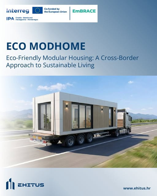 Kratki opis projekta: Projekt ECO-MODHOME ima za cilj smanjenje građevinskog otpada, povećanje dostupnosti održivog stanovanja i unapređenje konkurentnosti malih i srednjih preduzeća. Ključni rezultati obuhvataju izgradnju funkcionalnih modularnih kuća, kreiranje marketinške strategije te osiguravanje dostupnosti u područjima sklonim katastrofama. Modularne kuće, zasnovane na naprednim tehnologijama poput 3D laserskog skeniranja, umjetne inteligencije i 3D ispisa, ponudit će energetski efikasne, prilagodljive i ekološki prihvatljive životne prostore. Međunarodna saradnja osigurat će usklađenost sa propisima obje zemlje i doprinijeti promociji regionalnog razvoja. Inovativnost, fokus na održivost i naglasak na ravnopravnost spolova u građevinskoj industriji ključne su karakteristike ovog projekta. U implementaciju projekta su uključeni partneri iz Hrvatske, Bosne i Hercegovine i Crne Gore. Projekat traje od 1. februara 2025. do 31. januara 2026. Ukupan budžet projekta iznosi 235.045,75 EUR od kojih je 85% finansirano iz programa Interreg IPA Hrvatska – Bosna i Hercegovina – Crna Gora (putem EmBRACE projekta). Više informacija o ovom projektu je dostupno na sljedećem linku: EmBRACE Small projects.