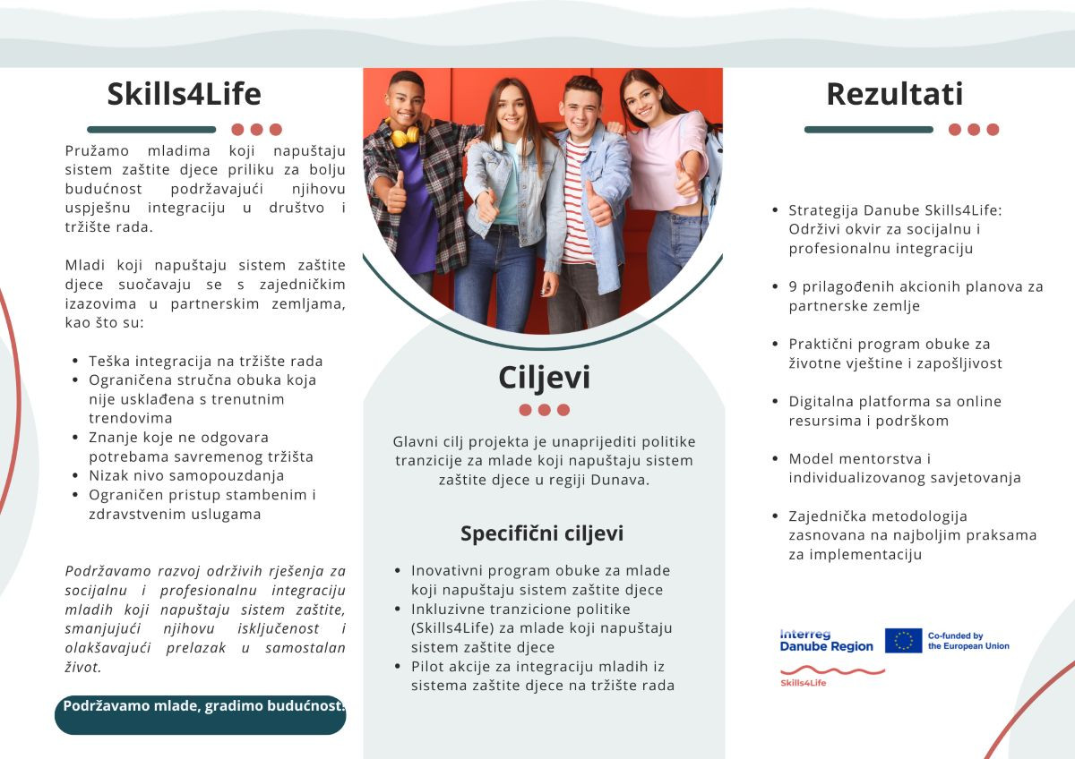 Kratki opis projekta: Projekat Skills4Life ima za cilj poboljšati javne politike i sisteme podrške za mlade koji napuštaju sistem zaštite – pružiti im obrazovanje, obuke, mentorstvo i savjetovanje, podići njihove vještine prilagođavanja, profesionalne i životne kompetencije, olakšati pristup tržištu rada, osamostaljenje i socijalnu inkluziju. Projekat će rezultirati transnacionalnom strategijom i akcionim planovima za održivu podršku u cijeloj regiji. Vodeći partner je Regionalna razvojna agencija Južna Muntenija (Rumunija), a projekat se implementira u devet država: Austrija, Bosna i Hercegovina, Bugarska, Hrvatska, Češka, Rumunija, Srbija, Slovenija i Ukrajina. Period implementacije projekta je od 1. aprila 2025. do 31. marta 2028. godine, dok ukupan budžet iznosi 1.984.011,00 EUR, od kojih je 80% finansirano iz Interreg Programa za dunavsku regiju. Više informacija o ovom projektu dostupno je na sljedećem linku: Skills4Life.