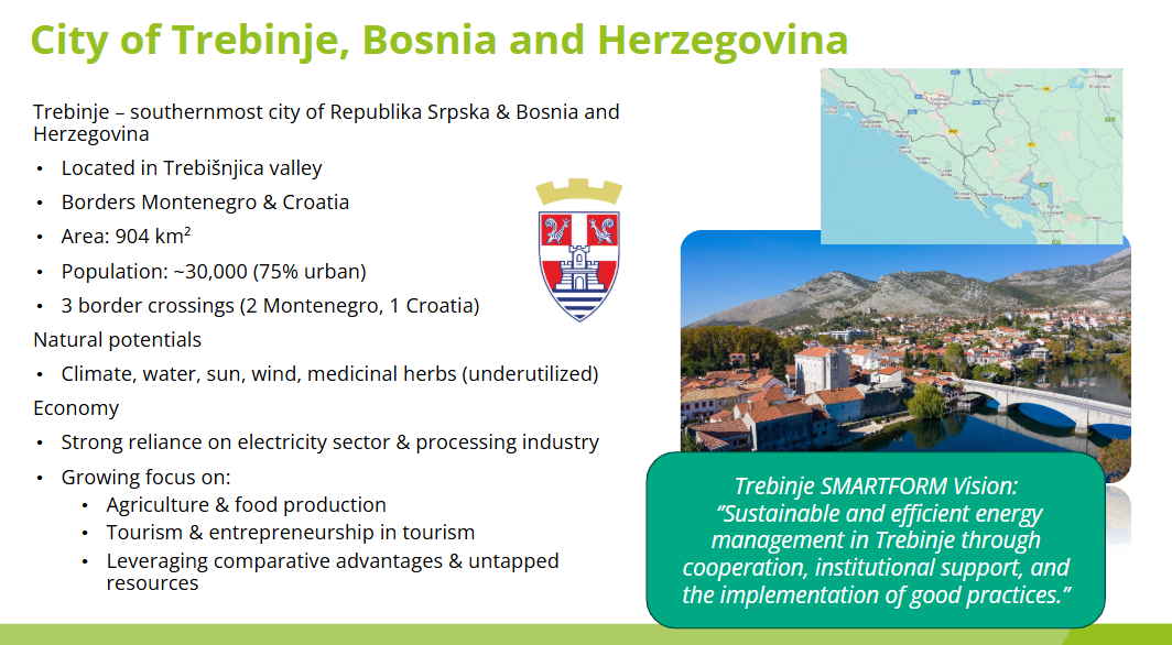 Kratki opis projekta: Projekat je usmjeren na ubrzanje tranzicije ka klimatskoj neutralnosti kroz lokalne inovacije, međuregionalnu saradnju i jačanje kapaciteta lokalnih vlasti. Polazi od ideje da klimatska neutralnost nije moguća bez aktivnog uključivanja zajednica, građana i lokalnih institucija. SMARTFORM koristi „Climate Transition Map“ metodologiju iz NetZeroCities, pomažući regijama da planiraju i upravljaju procesima smanjenja emisija. Projekt okuplja 10 partnera iz 8 zemalja – Grčke (vodeći partner: Centre for Research and Technology Hellas (CERTH)), Irske, Rumunije, Crne Gore, Moldavije, Latvije, Nizozemske i Bosne i Hercegovine (Grad Trebinje) — u zajedničkom radu na unaprjeđenju lokalnih i regionalnih politika klimatske tranzicije. Projekat traje od 01. maja 2025. do 31. jula 2029. godine. Ukupan budžet projekta iznosi 1.649.530,00 EUR. Više informacija o ovom projektu dostupno je na sljedećem linku.