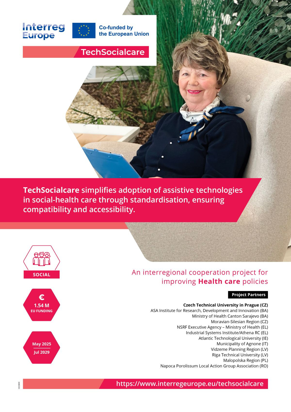Kratki opis projekta: Evropske zemlje suočavaju se sa sve većom potrebom za učinkovitim zdravstvenim i socijalnim uslugama zbog starenja populacije i porasta hroničnih bolesti. TechSocialcare ima za cilj razviti i promovirati tehničke standarde i osnovne funkcionalne zahtjeve za asistivne tehnologije i IKT alate u socijalnoj i zdravstvenoj zaštiti, kako bi se osigurala interoperabilnost, kvalitet i efikasnost usluga. Projekat uključuje međunarodnu razmjenu iskustava, razvoj pravnog okvira i standarda te poboljšanje politika u oblasti socijalnih i zdravstvenih tehnologija. U projektu učestvuje 12 partnera iz 9 zemalja (Španija, Francuska, Poljska, Švedska, Sjeverna Makedonija i Bosna i Hercegovina). Projekat traje od 01. maja 2025. do 31. jula 2029. godine, a ukupan budžet iznosi 1.966.764,00 EUR. Više informacija o ovom projektu dostupno je na sljedećem linku.