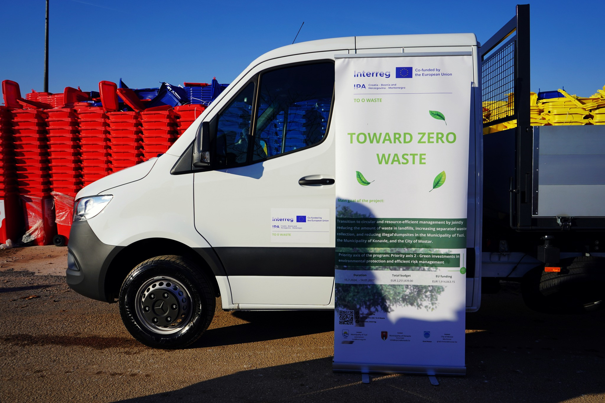 Kratki opis projekta: Cilj projekta je poboljšati osnovne uslove za implementaciju politika kružne ekonomije u Opštini Tuzi (CG), Opštini Konavle (HR) i Gradu Mostaru (BiH) ulaganjem u potrebnu opremu za upravljanje otpadom. Planirana je revitalizacija lokacija nelegalnih odlagališta na području projekta, uključujući instalaciju video nadzora za sprječavanje stvaranja nelegalnih odlagališta. Nadalje, predviđa se organizacija edukativnih događaja za sve relevantne aktere u upravljanju otpadom na području projekta s ciljem podizanja svijesti i unapređenja znanja u oblasti kružne ekonomije. Također, bit će provedena i sveobuhvatna medijska kampanja, kao i aktivnosti usmjerene na podizanje svijesti učenika srednjih škola na području projekta (predavanja, kviz, umjetnički natječaj i sl.). Konačno, planirana je izrada plana upravljanja glomaznim otpadom koji će se primjenjivati u Opštini Tuzi i Gradu Mostaru. Vodeći partner je Opština Tuzi, a projekat se implementira u tri države: Hrvatska, Bosna i Hercegovina i Crna Gora. Projekat traje od 15. jula 2024. do 14. januara 2027. Ukupan budžet projekta iznosi 2.251.839,00 EUR, od kojih je 85% finansirano iz programa Interreg IPA Hrvatska – Bosna i Hercegovina – Crna Gora. Više informacija o ovom projektu je dostupno na sljedećem linku: TO 0 WASTE.