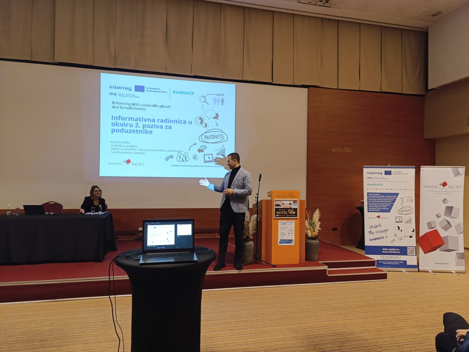 Informativne radionice organizovala je Hrvatska agencija za malo gospodarstvo, inovacije i investicije (HAMAG-BICRO) u okviru projekta EmBRACE (Enhancing MSEs sustainaBle gRowth And CompEtitiveness). Cilj ovog projekta je potaknuti rast i unapređenje konkurentnosti mikro i malih preduzeća u pograničnom području Hrvatske, Bosne i Hercegovine i Crne Gore.